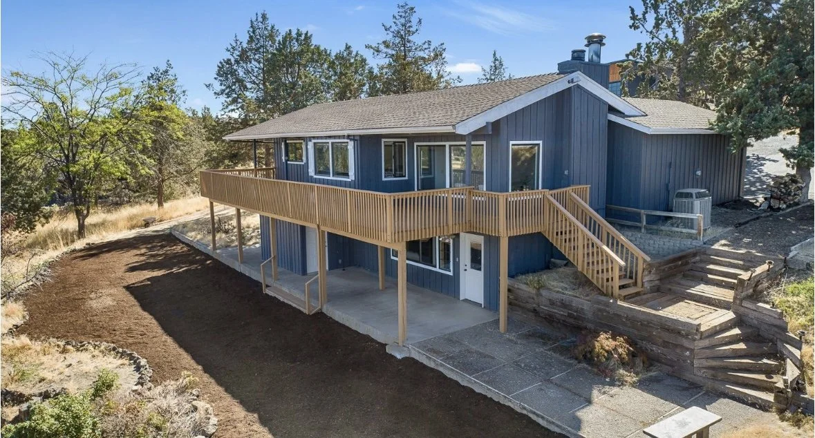 Private home located on 2.25 acres with views of the Cascade Mountains, Smith Rock, and surrounding farmland. Recently updated with fresh interior and exterior paint and offers a natural landscape. An expansive, newly stained deck extends from the kitchen, living, and dining areas, showcasing views of the Three Sisters and a direct vantage of Smith Rock. The main level includes a primary suite with full bath, two additional bedrooms, a second full bath, and a spacious kitchen with updated counters, dining area, and living room. The lower level features a MIL-style separate living space with an additional bedroom, third full bath, laundry room, and direct outdoor access from both the bedroom and living area. Set in the desirable Cinder Butte Estate West subdivision between Redmond and Terrebonne, the home sits on an elevated butte offering privacy and stunning valley views.